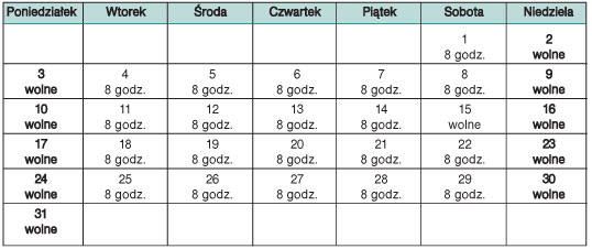 W sierpniu br. przypada do przepracowania 160 godzin. Pracując zgodnie z powyższym rozkładem czasu pracy pracownicy zachowają ten wymiar godzin pracy. Będę też mieli zapewnioną właściwą liczbę dni wolnych z tytułu pięciodniowego tygodnia pracy, niedziel i świąt.